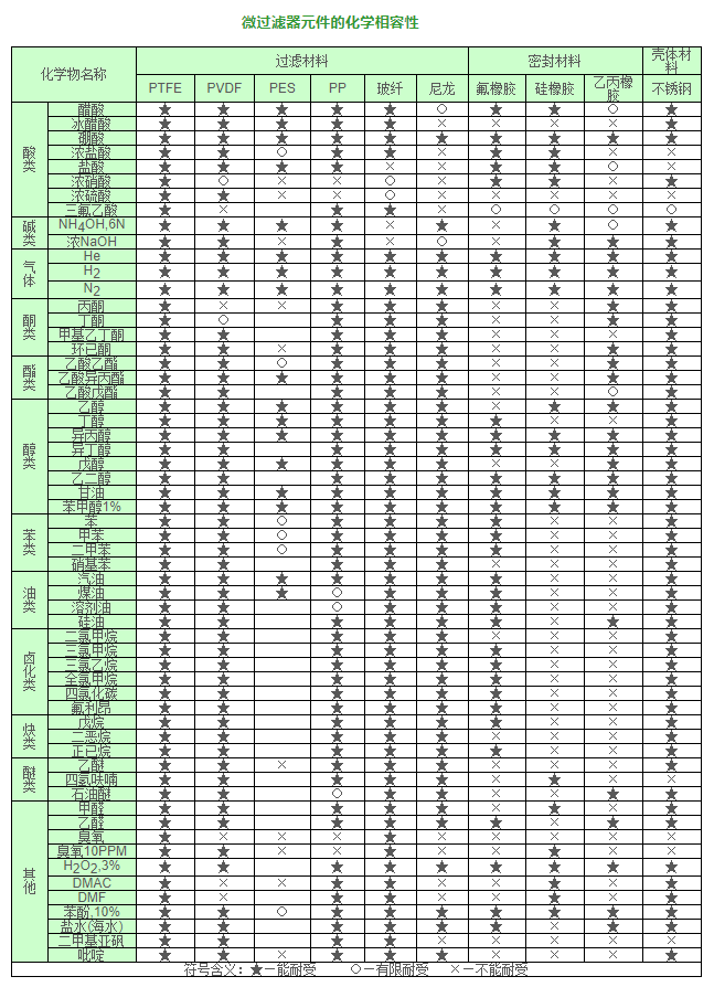 微過濾器元件的化學相容性