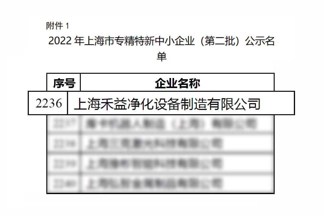 近日,上海市經(jīng)濟(jì)和信息化委員會公示2022年上海市“專精特新”企業(yè)名單(第二批),經(jīng)過專家評審與綜合評估,上海禾益凈化設(shè)備制造有限公司(簡稱:禾益環(huán)境)獲評“上海市專精特新中小企業(yè)”稱號!